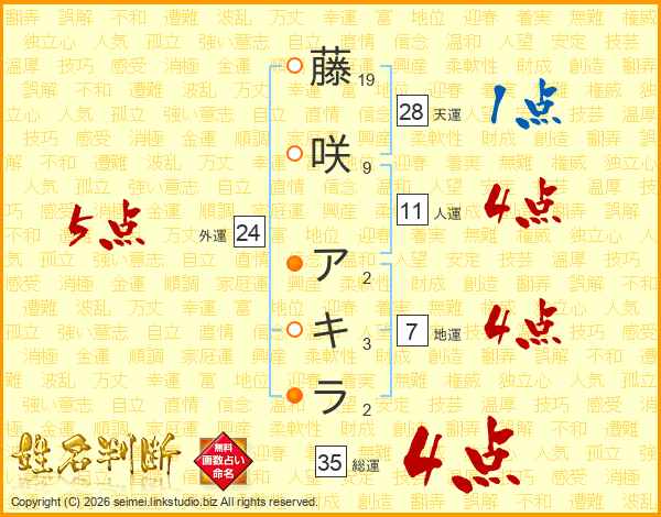 藤(19画)咲(9画) ア(2画)キ(3画)ラ(2画)