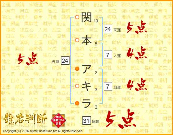 関本アキラさんの総運は31画の5点