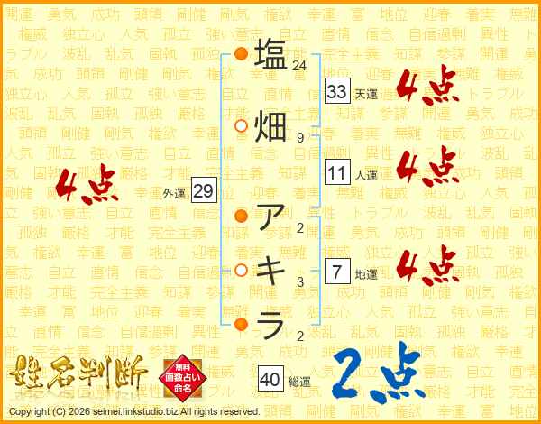 塩(24画)畑(9画) ア(2画)キ(3画)ラ(2画)