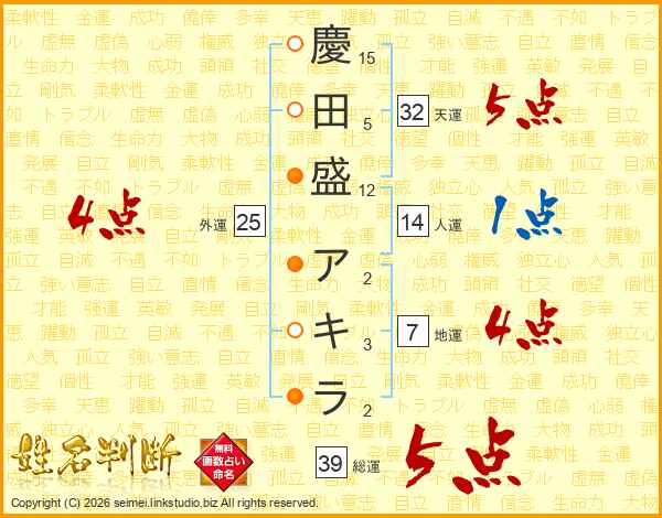 慶(15画)田(5画)盛(12画) ア(2画)キ(3画)ラ(2画)