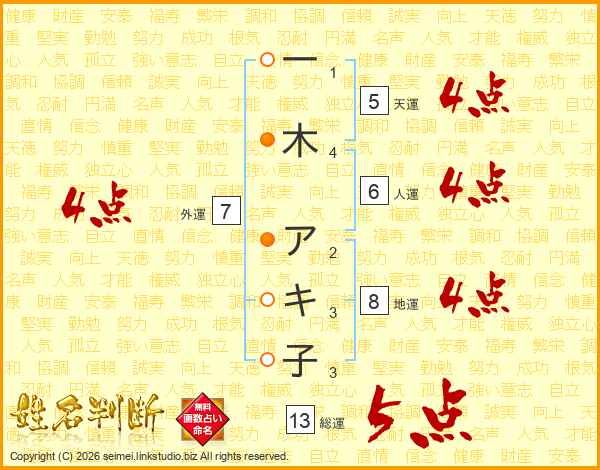 一木アキ子さんの総運は13画の5点!