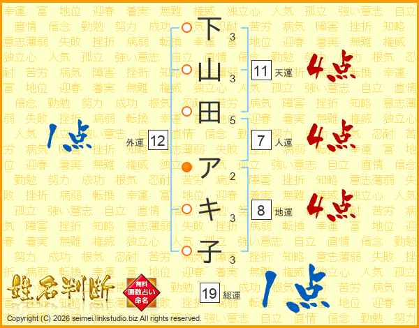 下(3画)山(3画)田(5画) ア(2画)キ(3画)子(3画)