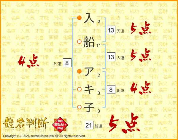 入船アキ子さんの天運は13画の5点!