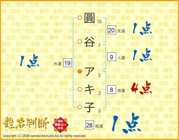 生活面を象徴する運勢です。外部から受ける影響力を表し、結婚運、家庭運や職場、環境への順応性を表します。総運から人運を引いた画数。姓や名が1文字の場合を除く。