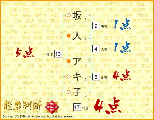 坂(7画)入(2画) ア(2画)キ(3画)子(3画)