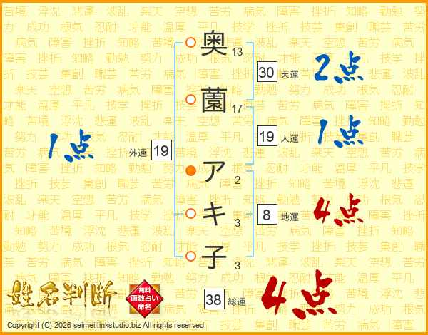 奥薗アキ子さんの総運は38画の4点!
