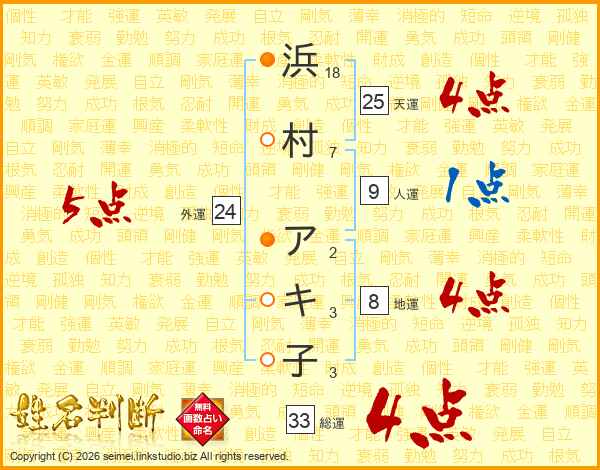 浜(18画)村(7画) ア(2画)キ(3画)子(3画)