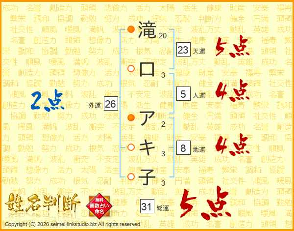 滝(20画)口(3画) ア(2画)キ(3画)子(3画)