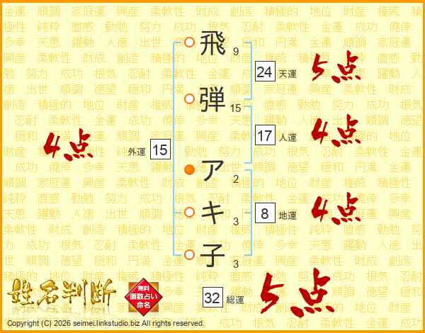 飛弾アキ子さんの外運は15画の4点!