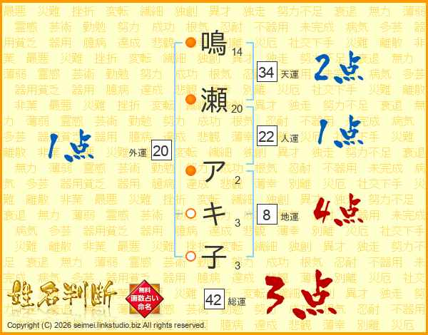 鳴瀬アキ子さんの総運は42画の3点!