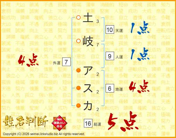 土(3画)岐(7画) ア(2画)ス(2画)カ(2画)
