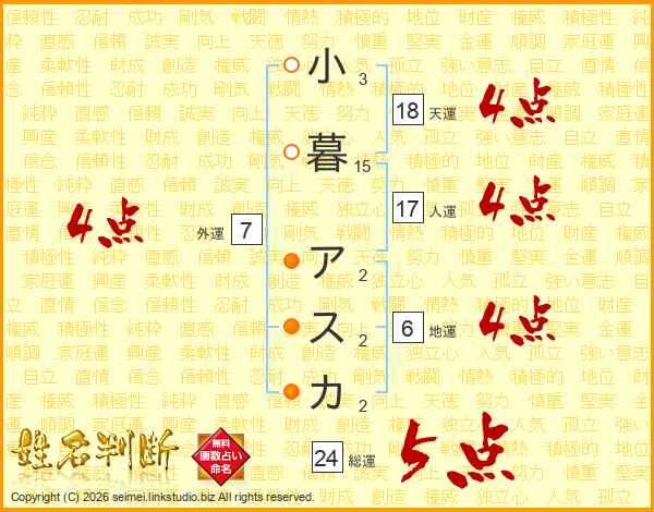 小(3画)暮(15画) ア(2画)ス(2画)カ(2画)