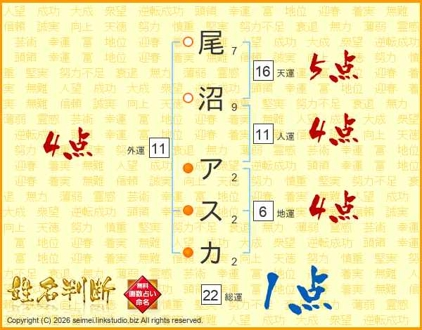 尾沼アスカさんの総運は22画の1点!