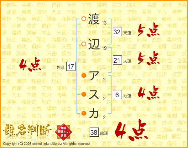 渡(13画)辺(19画) ア(2画)ス(2画)カ(2画)