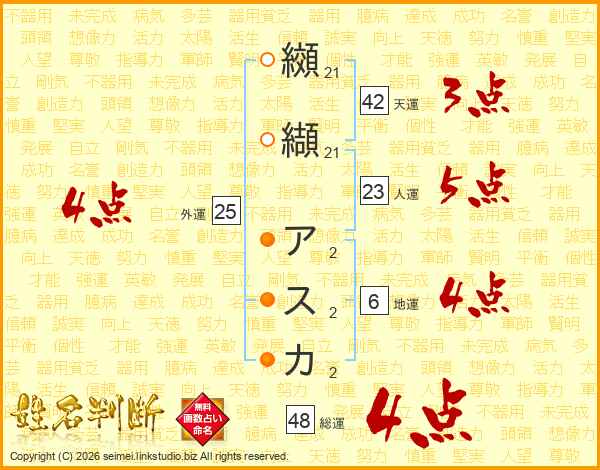 生活面を象徴する運勢です。外部から受ける影響力を表し、結婚運、家庭運や職場、環境への順応性を表します。総運から人運を引いた画数。姓や名が1文字の場合を除く。