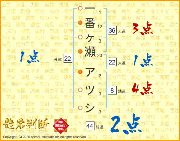 一番ヶ瀬アツシさんの総運は44画の2点!