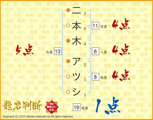 生活面を象徴する運勢です。外部から受ける影響力を表し、結婚運、家庭運や職場、環境への順応性を表します。総運から人運を引いた画数。姓や名が1文字の場合を除く。