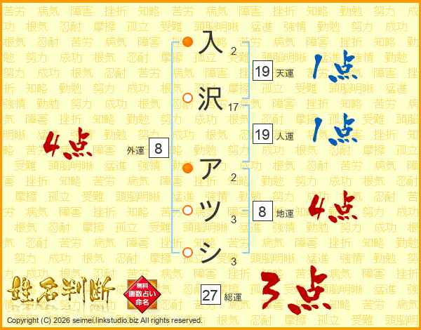 入沢アツシさんの総運は27画の3点!