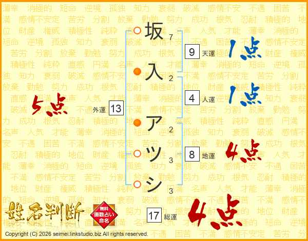坂入アツシさんの総運は17画の4点!