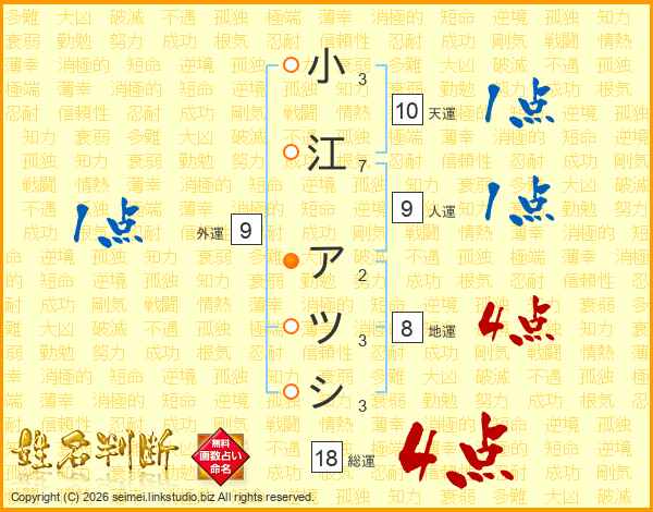 生活面を象徴する運勢です。外部から受ける影響力を表し、結婚運、家庭運や職場、環境への順応性を表します。総運から人運を引いた画数。姓や名が1文字の場合を除く。