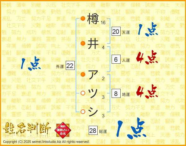 生活面を象徴する運勢です。外部から受ける影響力を表し、結婚運、家庭運や職場、環境への順応性を表します。総運から人運を引いた画数。姓や名が1文字の場合を除く。