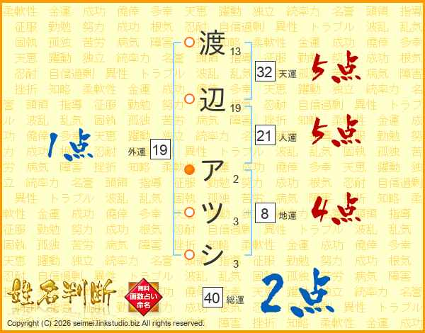 渡辺アツシさんの総運は40画の2点!
