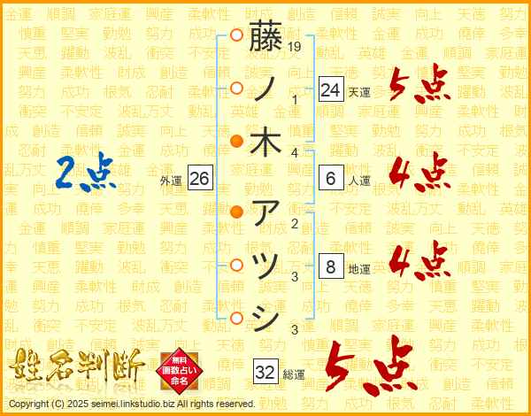 藤ノ木アツシさんの総運は32画の5点!