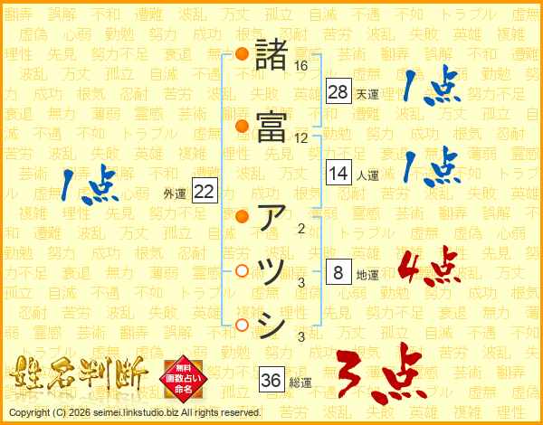 諸(16画)富(12画) ア(2画)ツ(3画)シ(3画)