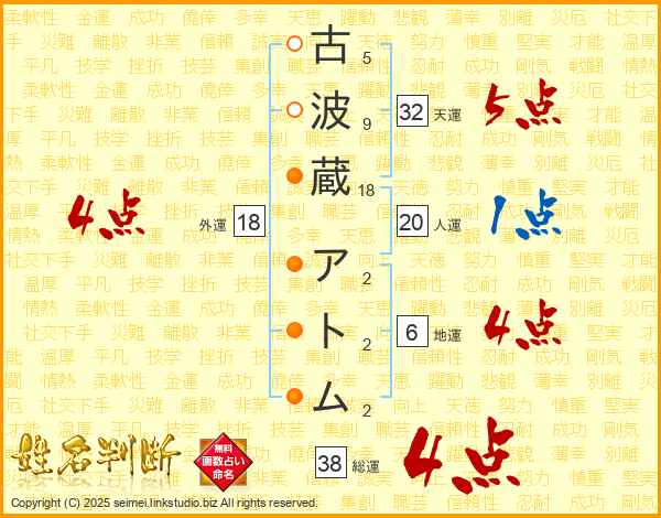 古(5画)波(9画)蔵(18画) ア(2画)ト(2画)ム(2画)
