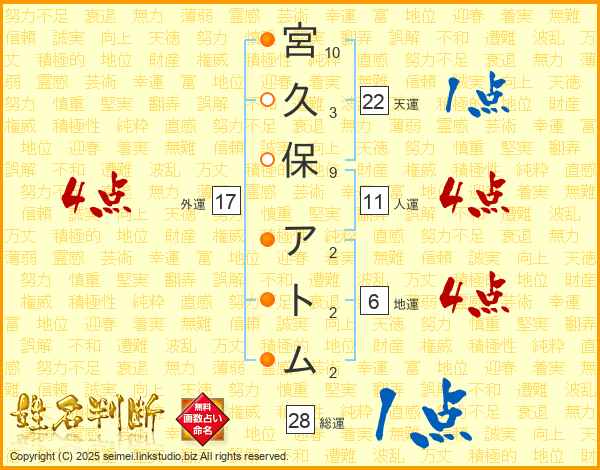生活面を象徴する運勢です。外部から受ける影響力を表し、結婚運、家庭運や職場、環境への順応性を表します。総運から人運を引いた画数。姓や名が1文字の場合を除く。