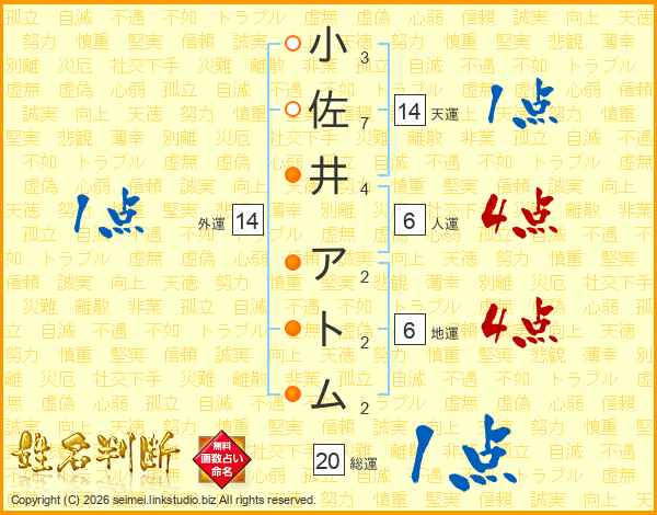 小佐井アトムさんの総運は20画の1点!