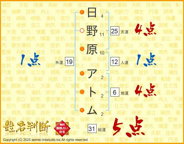 日(4画)野(11画)原(10画) ア(2画)ト(2画)ム(2画)