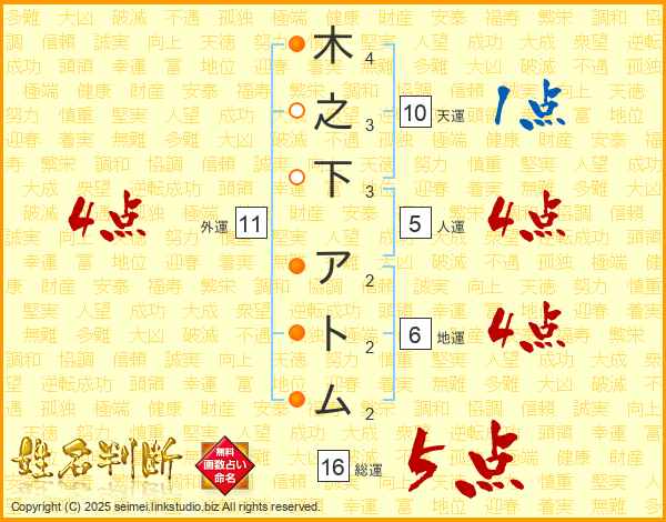 木(4画)之(3画)下(3画) ア(2画)ト(2画)ム(2画)