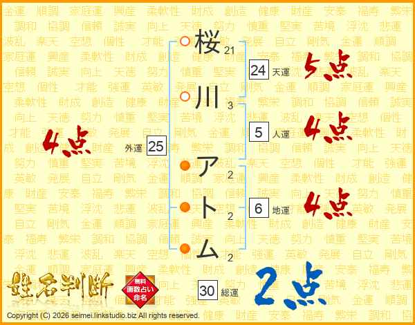 桜川アトムさんの総運は30画の2点!