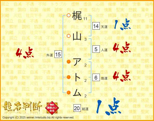 梶(11画)山(3画) ア(2画)ト(2画)ム(2画)