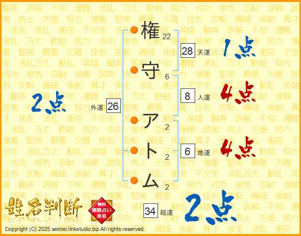 権守アトムさんの総運は34画の2点!
