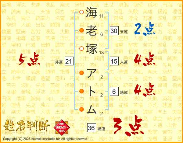 海(11画)老(6画)塚(13画) ア(2画)ト(2画)ム(2画)