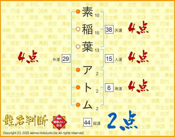 素(10画)稲(15画)葉(13画) ア(2画)ト(2画)ム(2画)