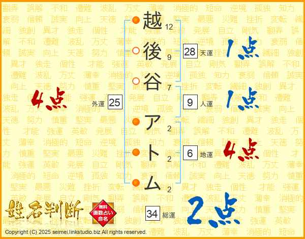生活面を象徴する運勢です。外部から受ける影響力を表し、結婚運、家庭運や職場、環境への順応性を表します。総運から人運を引いた画数。姓や名が1文字の場合を除く。
