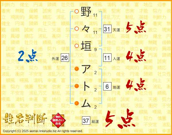 野々垣アトムさんの総運は37画の5点!
