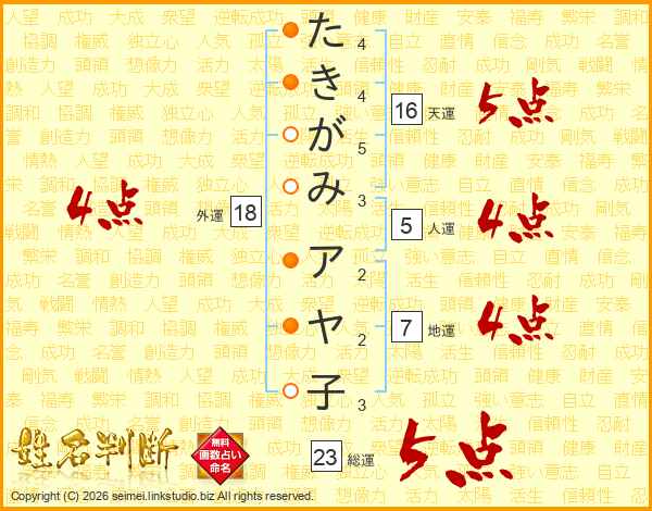 あなたの人生を表す1番重要な運勢です。生涯を通じて影響する総合運となり、主に50歳以降の晩年期に影響を及ぼします。苗字と名前の合計画数。