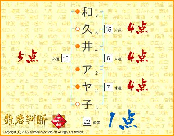 生活面を象徴する運勢です。外部から受ける影響力を表し、結婚運、家庭運や職場、環境への順応性を表します。総運から人運を引いた画数。姓や名が1文字の場合を除く。