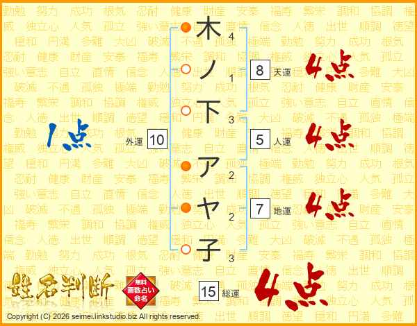 木ノ下アヤ子さんの総運は15画の4点!