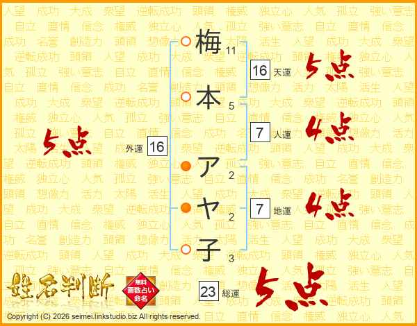 梅本アヤ子さんの総運は23画の5点!