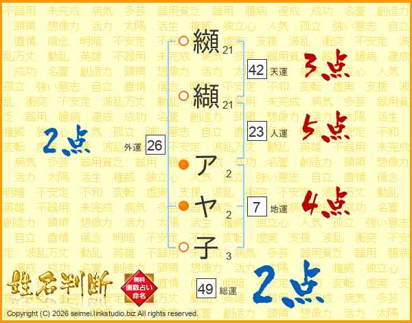 纐纈アヤ子さんの総運は49画の2点!
