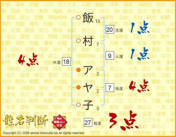 飯村アヤ子さんの総運は27画の3点!