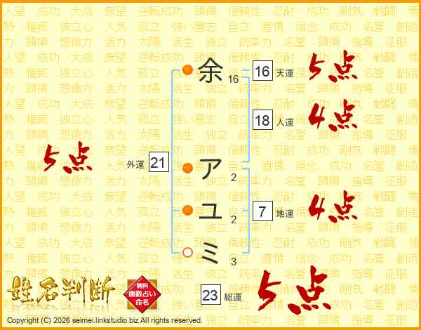 余(16画) ア(2画)ユ(2画)ミ(3画)