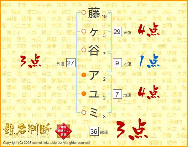 藤ヶ谷アユミさんの総運は36画の3点!