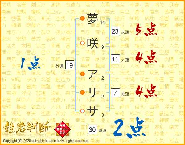 夢咲アリサさんの総運は30画の2点!