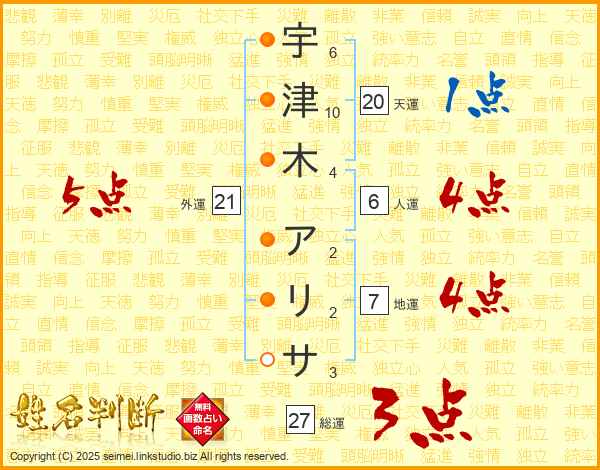 宇(6画)津(10画)木(4画) ア(2画)リ(2画)サ(3画)